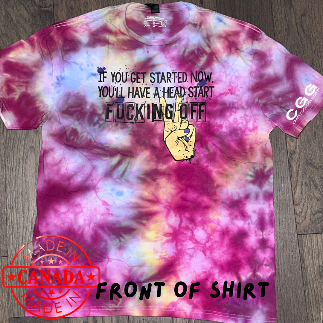 Elevate your wardrobe with this bold, funny tie dye t-shirt that’s equal parts motivational and hilariously savage! Featuring the epic slogan: “If you get started now, you’ll have a head start FUCKING OFF” paired with a cheeky middle finger graphic, this sarcastic graphic tee perfectly captures that ultimate procrastination energy. Whether you’re embracing your inner slacker, gifting a laugh to your lazy bestie, or just need some adult humor apparel to brighten your day, this shirt delivers unapologetic vibes.